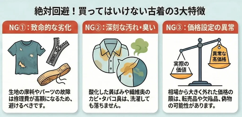 では具体的に、どんな古着を避ければいいのか。ポイントは次の3つです。