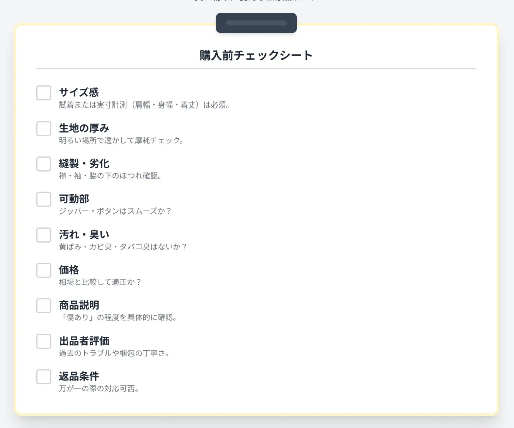 | ⑧出品者評価 | ・評価やレビューを確認・過去の取引トラブルの有無、梱包や対応の丁寧さ |