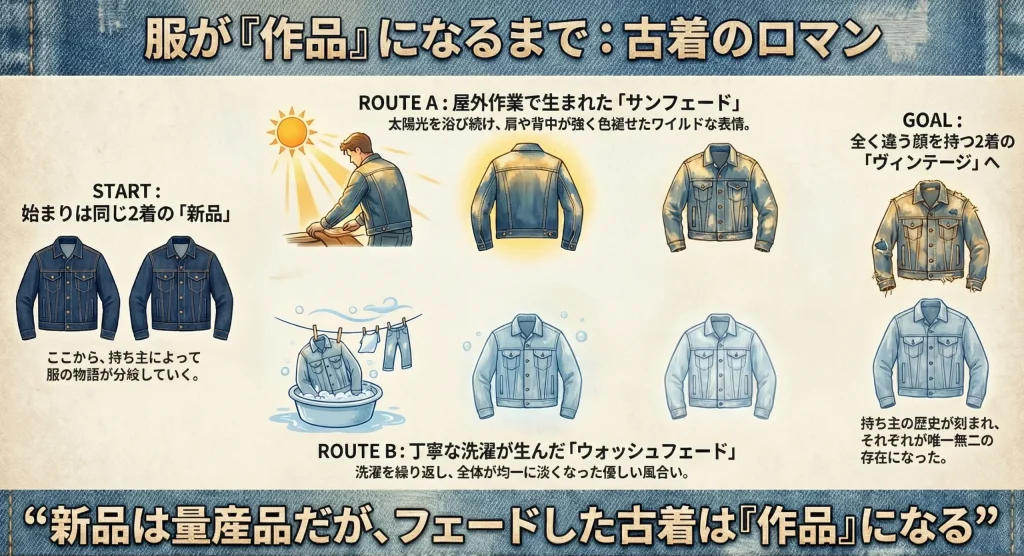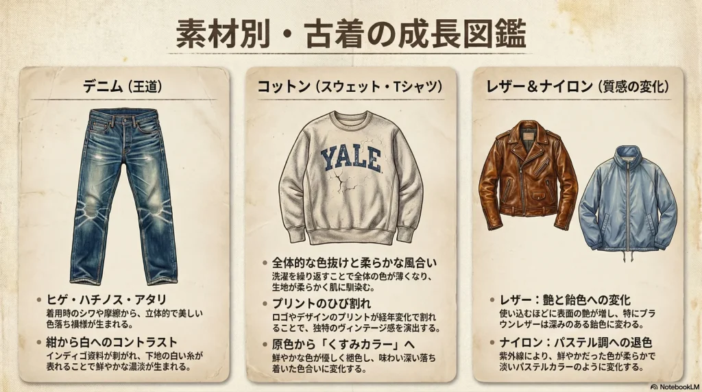素材ごとの変化を知ると、古着選びがもっと楽しくなりますよ。