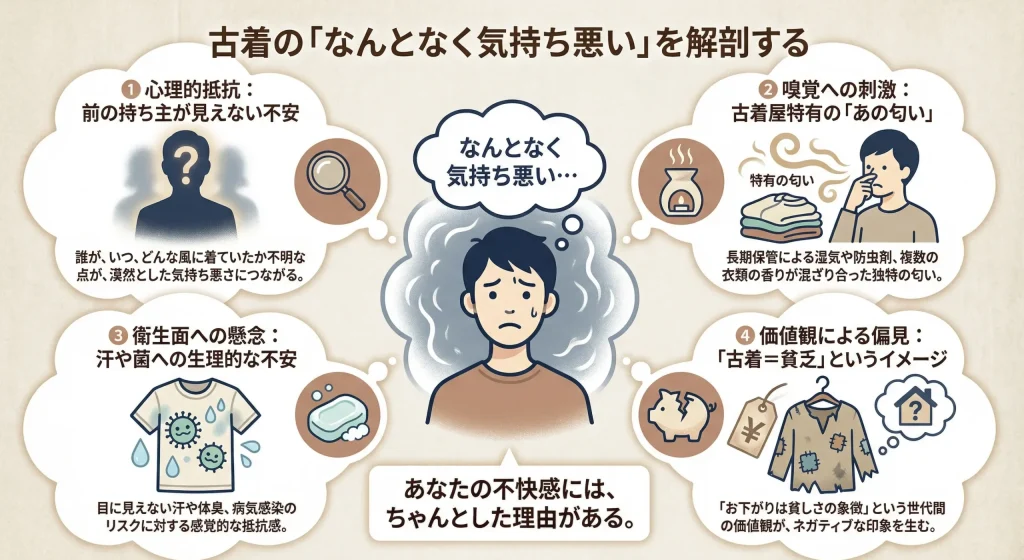 誰が着ていたか分からない不安、古着屋特有の匂い、衛生面への抵抗感。こうした感覚には明確な理由があります。