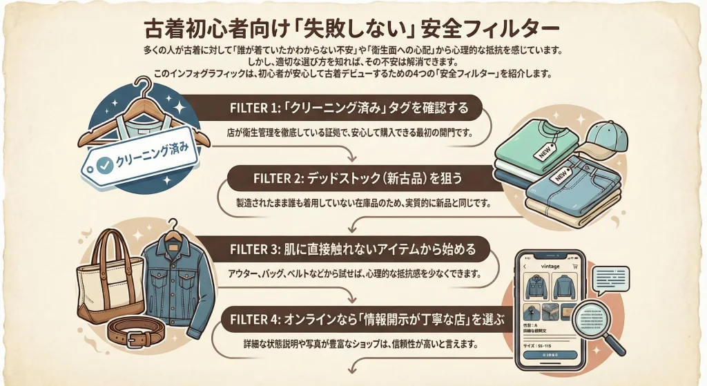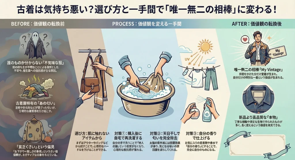 最初はクリーニング済みタグのある店や、デッドストック品、肌に触れないアウターから始めてみてください。購入後は自分で洗濯して、天日干しと消臭スプレーで匂いを除去し、お気に入りの香りをつければ完全に自分のものになります。