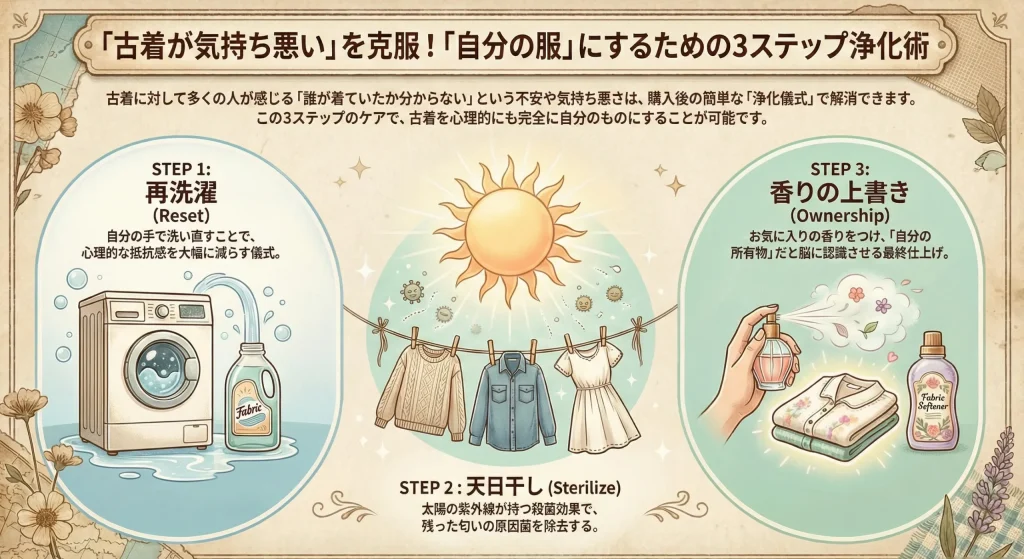ここでは、購入後に実践すべき3つの対策を具体的に解説します。この3ステップで、古着は完全にあなたのものになりますよ。