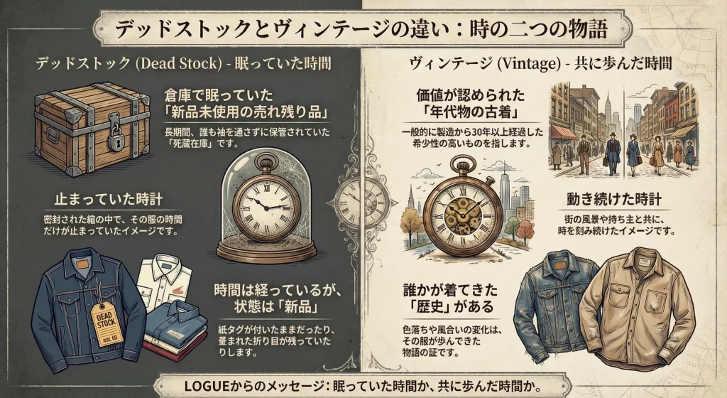 デッドストックとヴィンテージの違い、正しく理解していますか。どちらも古い時代の服だけど、新品か古着かという決定的な違いがあるんです。