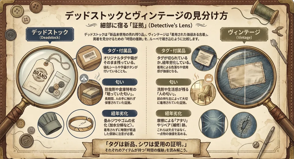 デッドストックもヴィンテージも古いアイテムですが、劣化の仕方が全然違うんです。この違いを理解しておくと、より正確に判断できますよ。