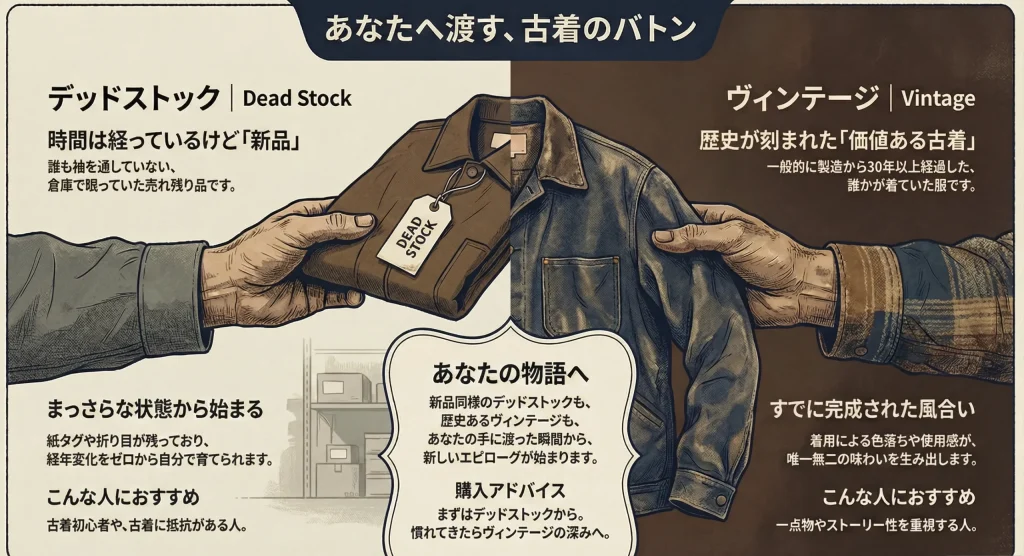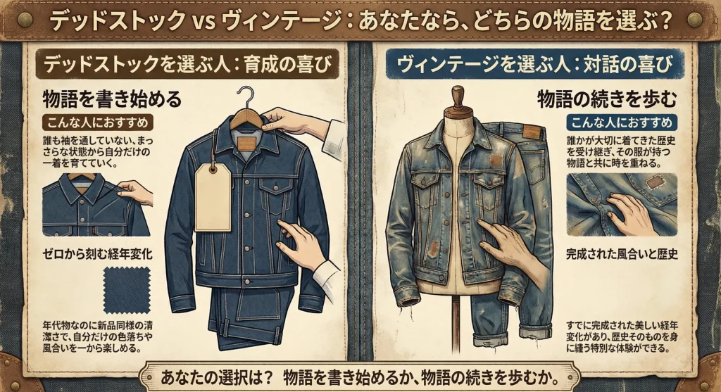 どちらも魅力的ですが、求めるものによって選ぶべきアイテムは変わります。新品状態で年代物を楽しみたいならデッドストック、完成された風合いと一点物の特別感を求めるならヴィンテージ。