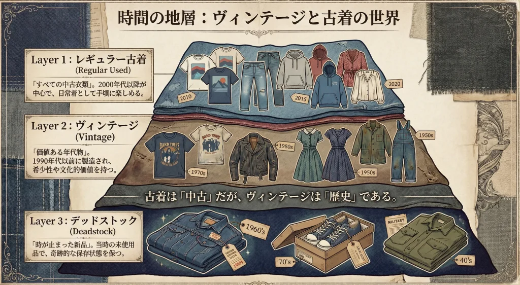 ここで混乱しがちなポイントを整理しましょう。ヴィンテージは古着の一種です。