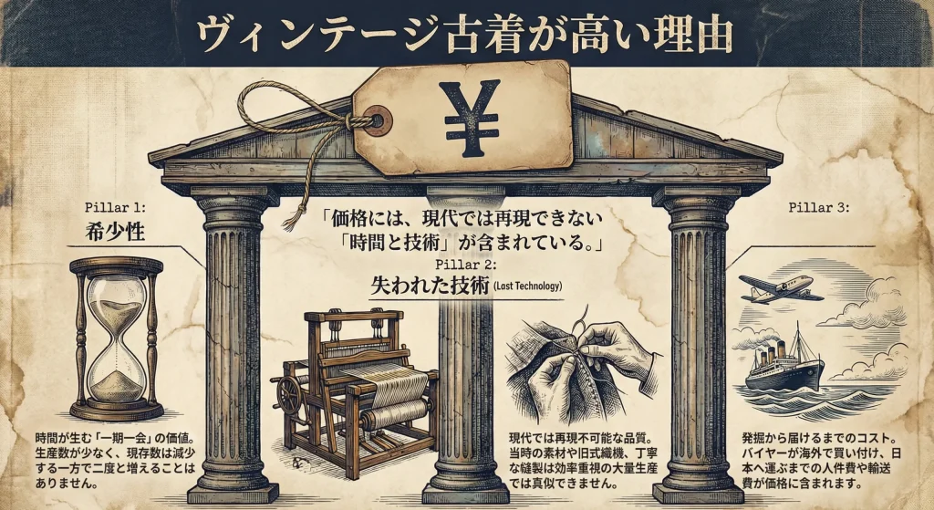 「同じ古着なのに、なんでヴィンテージはこんなに高いの?」って思いますよね。実は、価格差には明確な理由があります。おもな3つの要因がこちら。