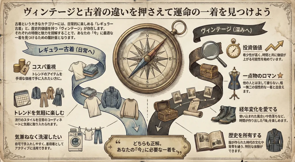 古着は中古服全般で、ヴィンテージはその中でも1990年代以前の価値ある年代物。レギュラー古着との違いは、年代・希少性・価格帯にあります。