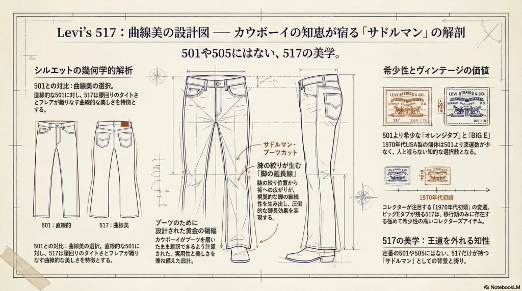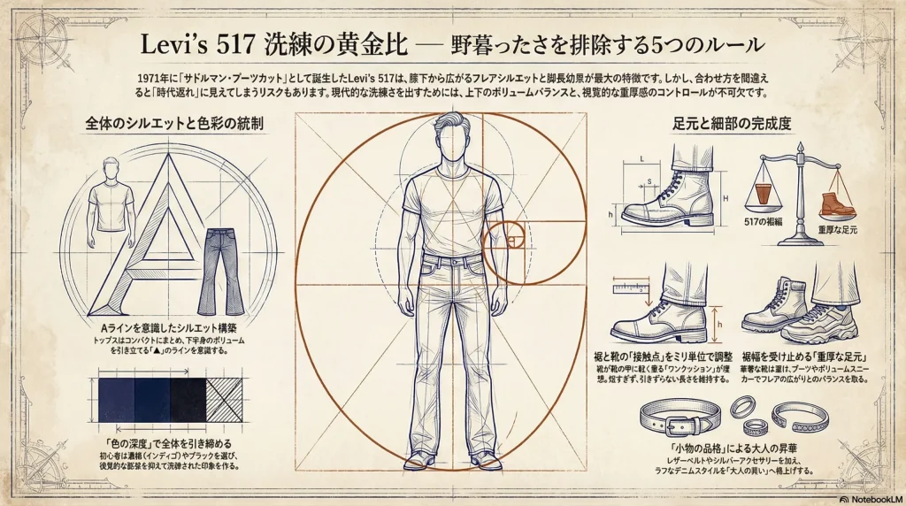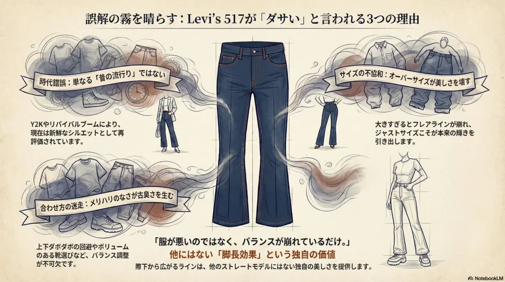 - 517がダサいと言われる理由は、フレアシルエット=流行遅れという誤解や、サイズ選びの失敗による野暮ったさにある