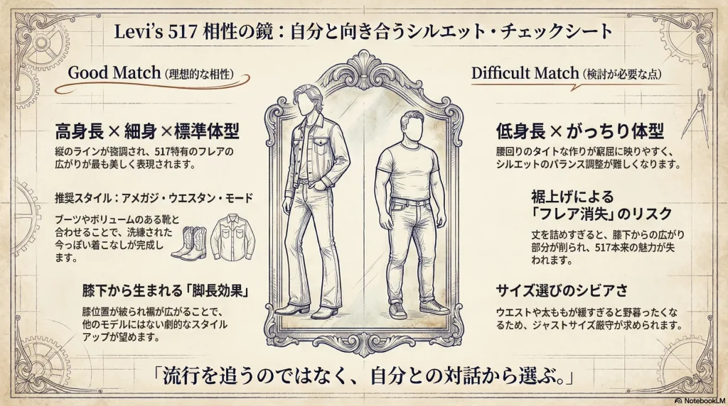 自分にLevi’s517が似合うかどうか、客観的に判断するためのポイントをまとめました。